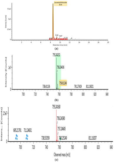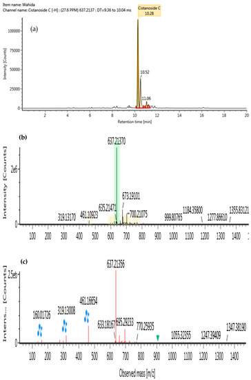 UHPLC-QTOF/MS chromatograms of cistanoside C from Barleria lupulina Lindl. leaf extract (BLLE): (a) chromatogram mass spectrum; (b) low energy of mass spectrum; (c) high energy of mass spectrum.