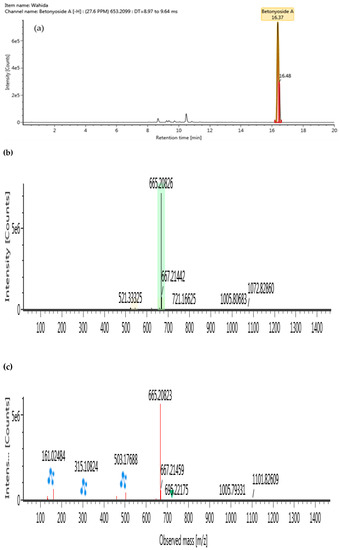 UHPLC-QTOF/MS chromatograms of betonyoside A from Barleria lupulina Lindl. leaf extract (BLLE): (a) chromatogram mass spectrum; (b) low energy of mass spectrum; (c) high energy of mass spectrum.