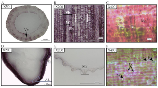 In black rice, anthocyanin is found at the different developmental stages in various tissues and organs, such as caryopsis, leaves blade, leaves sheath, internodes, stems ligules, apiculus, and stigmas and can be visualized with naked eyes or under a microscope. While in some black rice, only some tissues and organs are pigmented, whereas, in other cultivars, all parts are fully and intensely colored. Most of the black rice cultivars do not display pigmentation phenotype until plants are 3–4 weeks old in normal condition. In this study, our black rice 18BLN6321 exhibits pigmentation in all parts at the flowering stage and filling stage (Figure 1). The purple to dark purple color that remained in the epidermal cells of the sections provides a good marker to recognize the anthocyanin-containing cells. These results indicated that anthocyanin might be sequestrated inside the cells that could be identified after the section (Figure 1C,D,F). Anthocyanins are not only found in the epidermal layer but have been identified in the walls of conducting vessels (Figure 1A,B,E).