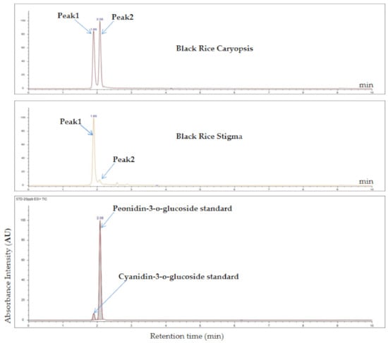 HPLC analysis of anthocyanins in the purple stigma and black caryopsis. Peak1 and peak2 represent cyanidin-3-glucoside (C3G) and peonidin-3-glucoside (P3G), respectively.