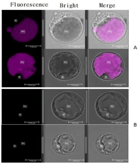 Confocal microscopy of unstained protoplast cells; (A), black rice 18BLN6321 showing fluorescence; (B), microscopy of brown rice 4233 no fluorescence. Va indicates the position of the vacuole lumen, while N indicates the position of the nucleus in cells.