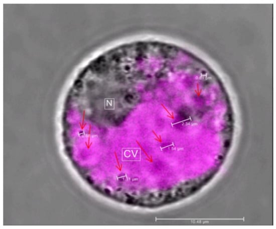 Identification and estimation of AVI sizes; CV and N are the position of central vacuole and nucleus, respectively; red arrows indicate different sizes of AVI identified.