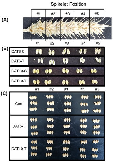 Spikelet position and seeds collected from spikes under high-temperature stress. (A) Division of a spike from base to top (spikelet #1–5). (B) Seeds taken from the five different sections of the spike. (C) Seeds from mature plants collected from the five different spike sections. Con, nontreated; DAT6-T, 6 days of treatment; DAT6-C, 6 days of nontreated control; DAT10-T, 10 days of treatment; DAT10-C, 10 days of nontreated control.
