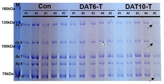 Total seed storage protein was extracted from seeds (Con, DAT6-T and DAF10-T, Figure 1C). Briefly, seeds were homogenized using a mortar and pestle. The resulting flour meal was suspended in a sample lysis solution (1 mL 70% ethanol) and incubated at 37 °C for 3 h with shaking (250 rpm). The mixture was centrifuged at 14,000 rpm at 4 °C. The supernatant was collected for gliadin. The precipitate was washed with washing buffer (50% (v/v) 1-propanal) and used for glutenin extraction. The remaining pellet was resuspended in 200 µL glutenin extraction buffer 1 (50% 1-propanol, 80 mM Tris-HCl (pH 8.0), 1% dithiothreitol (DTT)) and incubated at 65 °C for 30 min. After adding glutenin extraction buffer 2 (glutenin extraction buffer 1 with 1.4% 4-vinylpyridine), the mixture was incubated at 65 °C for 5 min. After centrifugation at 18,341× g for 10 min at 4 °C, the supernatant was collected for glutenin. The protein content was determined using the Bradford assay [].