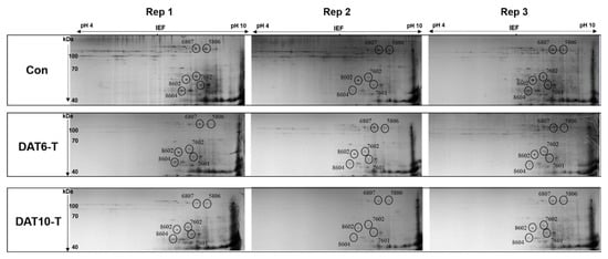 Gluten proteins extracted from the total grains of Con, DAT 6-T, and DAT 10-T plants were analyzed by 2DE-PAGE (Figure S1 and Figure 3). A total of 111 spots were separated by 2DE (pI range of 4–10 for the first dimension and size range of 0–120 kDa for the second dimension). These protein spots were grouped by their expression patterns in the Con, DAT 6-T, and DAT 10-T samples (Figure S2, Table S1). The spots showing a unique pattern of decrease as heat treatment progressed (DAT6-T to DAT10-T) included six glutenins, 11 alpha/beta-gliadins, and 18 nongluten proteins classified by size. Of the spots that showed decreased contents in heat-stressed plants, six (Spot No. 5806, 6807, 7601, 7602, 8602, and 8604) were selected for further study (Figure 3).