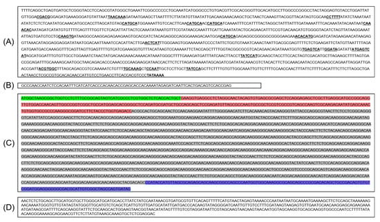 Complete Keumgang TaHMW1D gene sequence, including the (A) promoter, (B) 5′ UTR, (C) CDS, and (D) 3′ UTR. Bold and underlined, transcription factor binding sites; green, signal peptide region; pink, N-terminal region; gray, repetitive region; blue, C-terminal region.