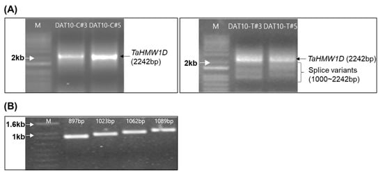 Identification of transcript variants. (A) Agarose gel (1%) showing the 2242-bp TaHMW1D gene product from control plants (left). The PCR products of high-temperature stress-treated wheat show smaller-sized (1000–2242 bp) transcript variants (right). (B) Sizes of the TaHMW1D transcript variants.
