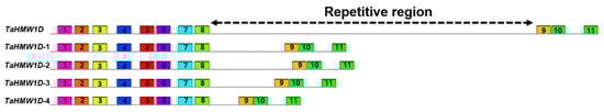 Conserved motif sequence alignments of TaHMW1D and its transcript variants in Keumgang. Motifs with identical sequences are given the same number. Signal peptide (1, 2), N-terminal region (3–8), C-terminal region (9–11). The region between motifs 8 and 9 is a repetitive sequence region in which deletion events occur.