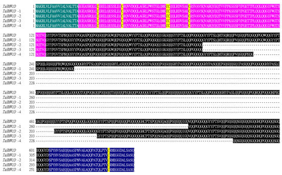 Protein sequence alignment of TaHMW1D and its transcript variants (TaHMW1D-1, 2, 3, 4) in Keumgang. Green, signal peptide; pink, N-terminal peptide; black, repetitive region; blue, C-terminal peptide. The conserved cysteine is marked in yellow.