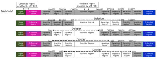 When cDNA of the full CDS region was compared with gDNA, the TaHMW1D repetitive region was found to have only one exon (Figure 4 and Figure S3). All transcript variants revealed truncated proteins, maintaining HMW-GS function, by deletion a thet repetitive region within one exon. While the amino acid sequence of HMW-GS has a highly repetitive structure comprising different motifs, the HMW-GS gene, which is driven by a typical eukaryotic promoter, does not contain introns []. In studies on Triticum aestivum, analysis of the genomic regions and phylogenetic analysis of the α-gliadin gene have suggested the creation of diverse A, B, and D subgenomes through an evolutionary process []. Nascent allohexaploid wheat evolution with DNA deletions through hybridization among Aegilops and Triticum is known to contribute to structural and functional diversity by changing repetitive regions of the wheat genome []. The repetitive sequence of wheat has been recombined through duplication, insertion, inversion, and translocation in the process of evolution of several species, such that it now constitutes diverse repeated sequences. The repeated regions, which consisted of tandem repeats, could be useful functional regions which underwent rapid variation and diverse morphological plasticity in response to the environment []; although TaHMW1D has only one exon, repetitive sequences could easily be changed by evolutionary processes. These processes also frequently occur in response to stress.