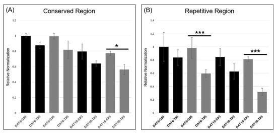 qRT-PCR was performed to quantitatively evaluate the expression of TaHMW1D transcript variants, targeting the amplification of deleted (repetitive region 4, Figure 8, present only in full-length TaHMW1D) and conserved (signal peptide and N-terminal region, present in both TaHMW1D and its transcript variants, Figure 8) regions using grain samples from DAT6-C, DAT6-T, DAT10-C, and DAT10-T taken from different positions along the spike (#3 and 5, Figure 1A). We found that TaHMW1D expression (determined by the conserved region) significantly decreased as heat treatment progressed. The amounts of the transcripts in DAT10-T were lower than those in DAT6-T. In addition, the samples from spike position #5 had lower transcript contents than those from spike position #3 (Figure 9A). In order to analyze the expression of the transcript variants in response to prolonged heat stress as well as to identify spike-position-dependent expression, qRT-PCR was performed using primers targeting the intercalating region of repetitive region 4. We found that expression of this region also significantly decreased as heat treatment progressed. Furthermore, significant decreases in transcript amount were observed in DAT10-T and at spike position #5 compared to those in DAT6-T and at spike position #3, respectively (Figure 9B). Given the expression data of these two regions, we can conclude that heat stress induces a decrease in TaHMW1D transcript abundance and a corresponding increase in expression of the four transcript variants, TaHMW1D-1, 2, 3, and 4, and that these phenomena also occur in grains located at spike position #5.