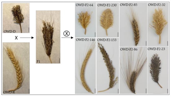 2 individuals because, in some plants with dense spikes, the phenotype is not as extreme as in the homozygous OWB-D parent (see OWB-F2-85 in