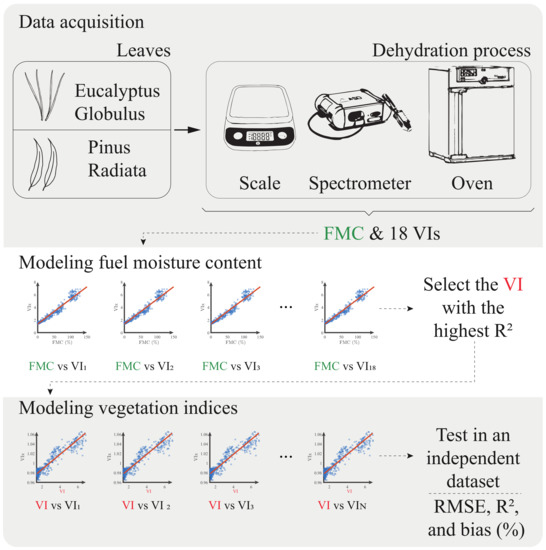 Figure 1 represents the work-flow followed in this study. It began with the acquisition stage, where leaves were collected and their reflectance spectrum measured. With this information, the fuel moisture content (FMC) and the eighteen vegetation indices were obtained. Then, the relationship of the fuel moisture content and the vegetation indices was expressed in terms of the coefficient of determination (). The index with the highest was selected as suitable, and then the models were obtained to recover the rest of the indices from the selected one. Finally, a validation stage was carried out with an independent dataset. Each of these stages is detailed below.