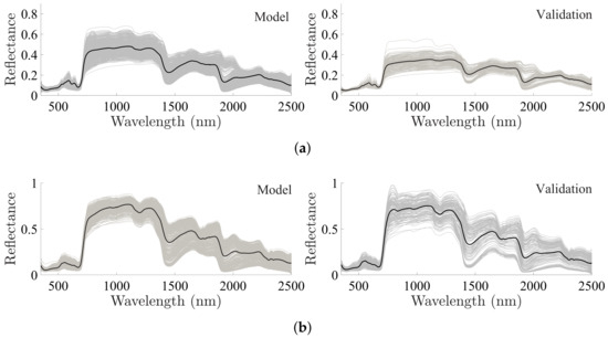 The assumption that the adjustment and validation sets are independent can be supported due to the difference in the mean spectrum of the two sets (see black line in Figure 2). Additionally, the spread of the individual reflectance spectra shows noticeable differences between the model and validation sets, as seen in Figure 2.
