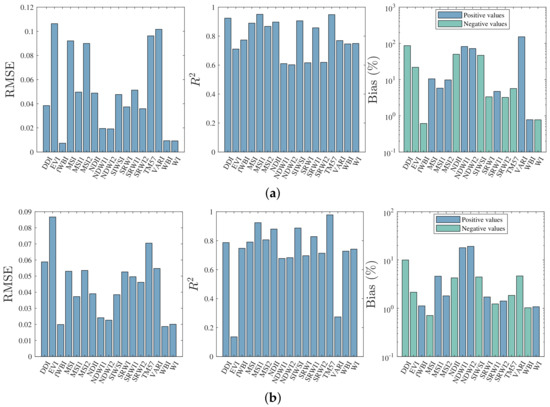 The 17 remaining spectral indices were calculated following Equation (3). For both species, the , the RMSE, and the percentage bias are depicted in Figure 3. The percentage bias was expressed with two different colors for positive and negative values—this distinction was made because the axis of the ordinates was logarithmic.
