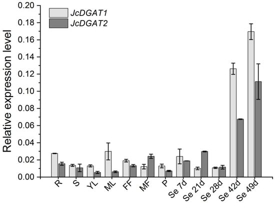 Expression patterns of JcDGAT1 and JcDGAT2 in J. curcas. The expression levels of JcDGAT1 and JcDGAT2 were analyzed in the roots (R), stems (S), young leaves (YL), mature leaves (ML), female flowers (FF), male flowers (MF), green pericarps (P), and seeds at 7, 21, 28, 42 and 49 days after pollination (DAP) (Se 7d, 21d, 28d, 42d and 49d, respectively). The qRT-PCR results were obtained from two independent biological replicates and three technical replicates. The levels were normalized using the amplified products of JcActin1. The values are presented as the means ± standard deviations.