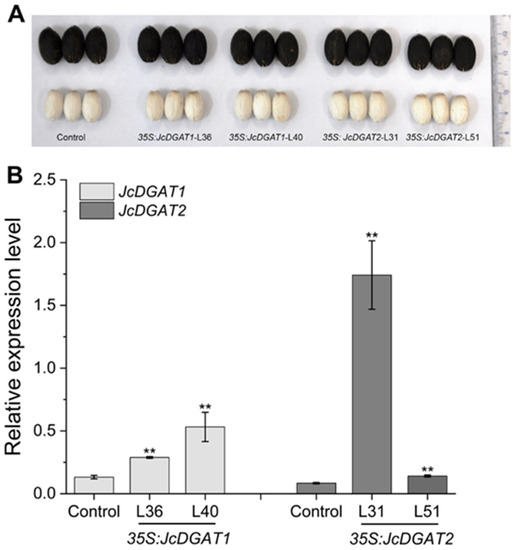 Appearance of seeds and kernels from 35S:JcDGATs transgenic J. curcas lines. (A) Phenotypes of seeds and kernels from control and transgenic lines. (B) The expression levels of JcDGAT1 and JcDGAT2 in the control and 35S:JcDGATs transgenic seed kernels. The expression levels were normalized using the amplified products of the JcActin1. The values are presented as the mean ± standard deviations (n = 3). The student’s t-test was used for statistical analyses. ** p ≤ 0.01.