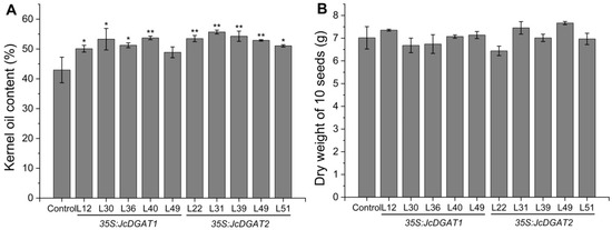 Seed kernel oil contents and dry weights in control and 35S:JcDGATs transgenic lines. (A) Total kernel oil content. (B) Dry weight of 10 seeds. The values are presented as the means ± standard deviations of three independent biological replicates. The student’s t-test was used for statistical analyses. * p ≤ 0.05, ** p ≤ 0.01.