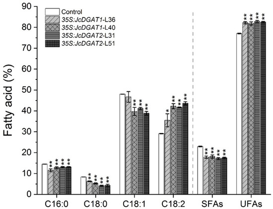 Fatty acid (FA) profiles of seed kernel oil in control and transgenic J. curcas. Saturated FAs (SFAs) indicate the sum of the contents of C16:0 and C18:0, and unsaturated FAs (UFAs) indicate the sum of the contents of C18:1 and C18:2. The values are presented as the mean ± standard deviation of three biological replicates. The student’s t-test was used for statistical analyses. * p ≤ 0.05, ** p ≤ 0.01.