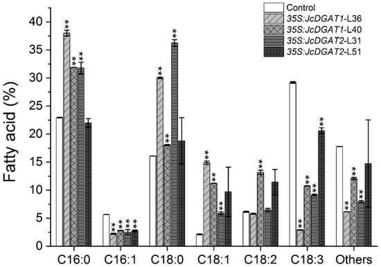 FA profile of TAGs in the leaves of control and transgenic plants. The values are presented as the mean ± standard deviation of two biological replicates. The student’s t-test was used for statistical analyses. ** p ≤ 0.01.