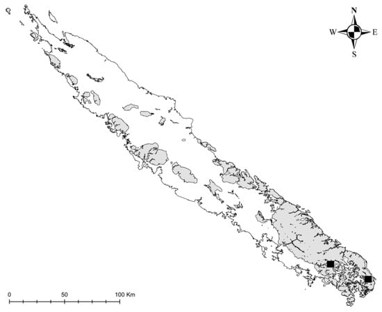 - Rendle, A.B.; Baker, E.G.; Moore, S.L.M. A Systematic Account of the Plants Collected in New Caledonia and the Isle of Pines by Prof. R. H. Compton, M.A., in 1914.-Part I. Flowering Plants (Angiosperms). J. Linn. Soc. Lond. Bot. 1921, 45, 245–417. [Google Scholar] [CrossRef][Green Version]