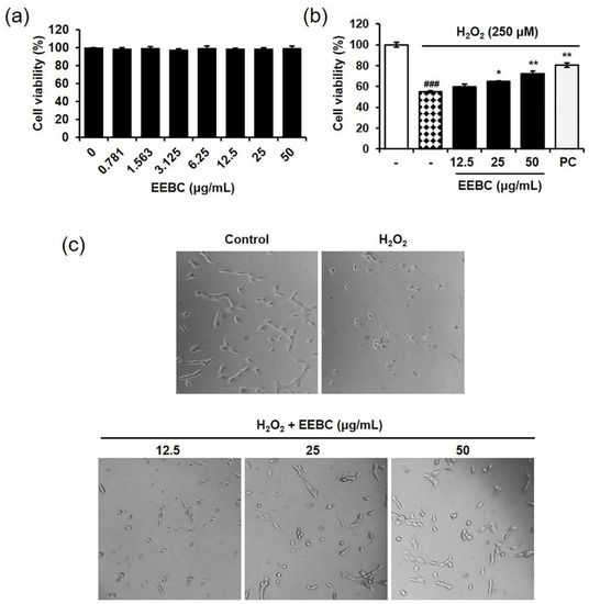 2.4. Protective Effects of EEBC in Hydrogen Peroxide (H2O2)-Induced Neuronal Cell Damage