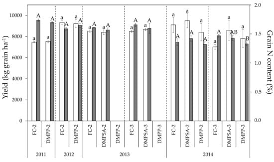 Yield (light bars) and grain N content (dark bars) in each crop cycle. For each parameter, treatments sharing the same letter (lowercase and uppercase letters for yield and grain N content, respectively) within each crop cycle and splitting treatment (separated by discontinue lines) do not differ significantly at p < 0.05.