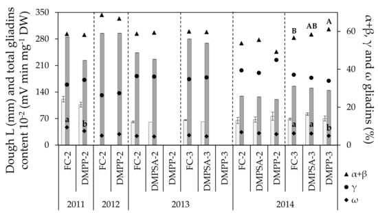 Dough extensibility (L, light bars), total grain gliadin content (represented as the total gliadin content divided by 100, dark bars) and grain gliadin fractions (α + β gliadins, γ gliadins and ω gliadins) in each crop cycle. Treatments sharing the same letter (uppercase and lowercase letters for α + β and ω gliadins, respectively) within each crop cycle and splitting treatment (separated by discontinue lines) do not differ significantly at p < 0.05.