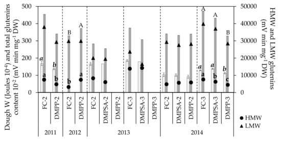 Dough strength (W, light bars), total grain glutenin content (represented as the total glutenin content divided by 100, dark bars) and grain fractions of high molecular weight (HMW) and low molecular weight (LMW) glutenins in each crop cycle. Treatments sharing the same letter (lowercase, cursive, and uppercase letters for HMW-glutenins, dough strength, and total glutenin content, respectively) within each crop cycle and splitting treatment (separated by discontinued lines) do not differ significantly at p < 0.05.