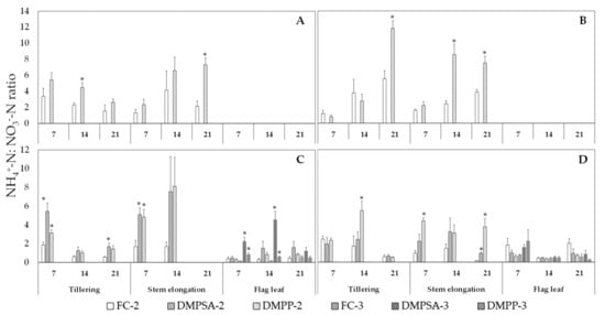 Ammonium: nitrate (NH4+-N:NO3−-N) ratio in 2011 (A), 2012 (B), 2013 (C) and 2014 (D). Values are presented 7, 14, and 21 days after each fertilization event (tillering, steam elongation, and flag leaf). An asterisk (*) indicates significant differences (p < 0.05) between DMPSA or DMPP and their respective fertilized control (FC-2 or FC-3) in each day and splitting treatment.