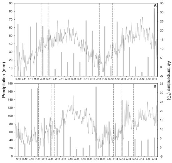 Monthly precipitation (bars) and daily mean air temperature (line) for the whole period of study in 2011 and 2012 (A) and in 2013 and 2014 (B). Vertical lines indicate N-fertilizer application.