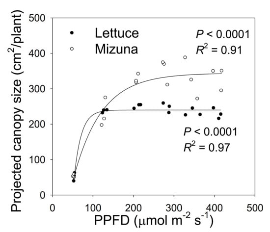 The projected canopy size (PCS) of mizuna (Brassica rapa var. japonica) and lettuce (Lactuca sativa ‘Green Salad Bowl’) plants grown at six different photosynthetic photon flux densities (PPFDs). Data were collected at the end of the growing cycle (27 and 28 days for mizuna and lettuce, respectively). Each data point represents the mean of nine plants.