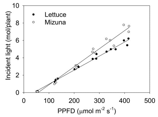The total incident light on the plant canopy throughout the growing period of mizuna (Brassica rapa var. japonica) and lettuce (Lactuca sativa ‘Green Salad Bowl’) plants grown at six different photosynthetic photon flux densities (PPFDs) for 27 and 28 days, respectively. Lines show the results from multiple regression analysis (R2 = 0.98), which indicated a significant species × PPFD interaction (p < 0.0001). Each data point represents the mean of nine plants.
