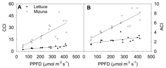 The anthocyanin content index (ACI) was measured to identify whether the two crops differ in anthocyanin accumulation in response to increasing PPFD. Anthocyanins in leaves have a protective role against intense light and help dissipate excess excitation energy [,]. The ACI of both species did indeed increase with increasing PPFD (Figure 4B). However, the ACI of both crops was much lower than those previously reported for red leaf basil (ACI of 28–81) [] and pak choi (ACI of 35–65) []. Consistent with the low ACI, we did not observe any red coloration on leaves of mizuna or lettuce, with increasing PPFD.
