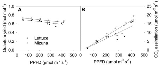 (A) Quantum yield of photosystem II and (B) net CO2 assimilation rate of mizuna (Brassica rapa var. japonica) and lettuce (Lactuca sativa ‘Green Salad Bowl’) plants grown and measured at six photosynthetic photon flux densities (PPFDs). Data were collected a day before the harvesting (26 and 27 days for mizuna and lettuce, respectively). Lines show the results from multiple regression analysis, which indicated no significant species × PPFD interaction for quantum yield (R2 = 0.72, interaction p = 0.62), but significant effects of PPFD and species (both p < 0.0001). For CO2 assimilation rate, there was a weak species × PPFD interaction effect (R2 = 0.91, interaction p = 0.08).