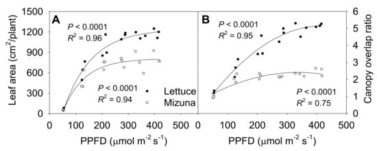 (A) Leaf area per plant and (B) canopy overlap ratio of mizuna (Brassica rapa var. japonica) and lettuce (Lactuca sativa ‘Green Salad Bowl’) plants grown at six different photosynthetic photon flux densities (PPFDs) for 27 and 28 days, respectively. The canopy overlap ratio is the ratio between the leaf area and the projected canopy size at harvest. Each data point represents the mean of nine plants.