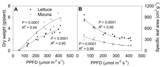(A) Shoot dry weight and (B) specific leaf area of mizuna (Brassica rapa var. japonica) and lettuce (Lactuca sativa ‘Green Salad Bowl’) plants grown at six different photosynthetic photon flux densities (PPFDs) for 27 and 28 days, respectively. Specific leaf area is the ratio between leaf area and dry weight. Each data point represents the mean of nine plants.