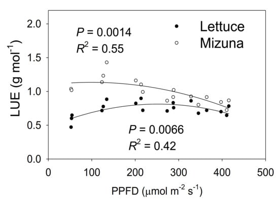 Mizuna had a higher LUE than lettuce (p < 0.0001) (Figure 8). The LUE of mizuna was ~1.1 g mol−1 at PPFDs up to 200 µmol m−2 s−1 and decreased to ~0.75 g mol−1 at a PPFD of 425 µmol m−2 s−1. In contrast, lettuce LUE was greatest at PPFDs of 125 to 350 µmol m−2 s−1 (~0.8 g mol−1) and ~0.6 g mol−1 at PPFDs of 50 and 425 µmol m−2 s−1.