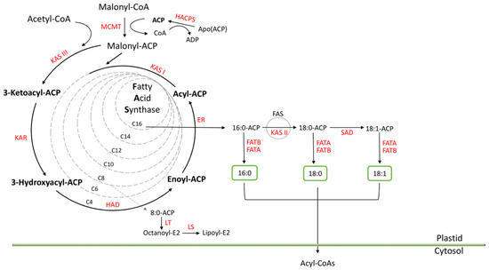 - Ohlrogge, J.B.; Jaworski, J.G. Regulation of fatty acid synthesis. Annu. Rev. Plant Biol. 1997, 48, 109e136. [Google Scholar] [CrossRef]