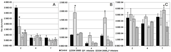 No significant difference with respect to the control was observed in the expression of PR1 at 2 and 4 dai. At 2 dai plants inoculated only with P. chlamydosporia showed a significantly higher expression (p < 0.05) than in the P. chlamydosporia plus P. infestans inoculation (Figure 1C). PR1 expression was significantly different from the control at 7 dai, showing the highest expression in the P. infestans treatment and a down-regulation in presence of both fungi (Figure 1C). The expression of the lipoxygenase D gene could only be detected at 7 dai, however, it was not significantly different (data not show).