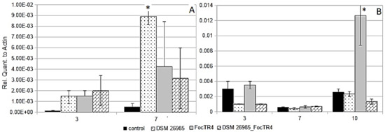 At 10 dai PIN II expression was significantly higher in leaves of plants inoculated only with FocTR4, with respect to the control (Figure 2B). PAL expression at 7 dai did not show significant differences among treatments or in comparison with the control. No expression of LOX was found in the experimental condition tested.