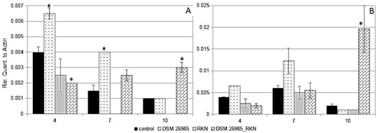Plants of banana cv Gran Enana maintained in a greenhouse, as previously described, were inoculated with 1 mL of a conidial suspension containing 1.8 × 106 conidia × mL−1 of P. chlamydosporia DSM 26985, as previously described. After 4 days, the pots were inoculated with 2000 juveniles (J2) and approximately 1000 vital eggs of the M. incognita of population MILEV-L4, originating from a single egg mass and proceeding from Leverano (Italy) and multiplied in a greenhouse on cherry tomato [38]. The infective individuals (J2 larvae) were obtained from eggs extracted from the infested roots by the hypochlorite method [39,40], and allowed to hatch in tap water at room temperature (20–24 °C), under a continuous air flow produced by a submersed peristaltic pump outlet. After inoculation, plants were maintained in greenhouse at 24–25 ± 4 °C with regular irrigation. The experimental design included four treatments—an untreated control, application of DSM 26985 only, inoculation with RKN only, and inoculation with DSM 26985 plus RKN, with four replicates each. The samples (around 200 mg of tissue) were collected from the banana apical leaves. Sampling time were 4, 7, and 10 dai with RKN. At the end-point, the plants were explanted and galling symptoms were checked under a light microscope.