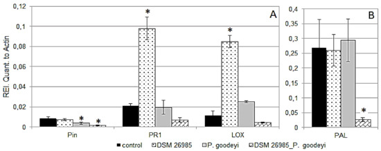 Gene expression of PIN II, PR1, lipoxygenase (LOX) (A) and PAL (B) at 21 dai in leaves of Gran Enana plants inoculated with P. goodeyi and/or P. chlamydosporia DSM 26985. Asterisks show significant differences from each untreated control, as shown by LSD test (* p < 0.05; bars = SE).