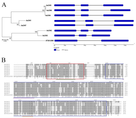 Phylogenetic analysis of the AsCHI protein sequences revealed three main clades: the first comprising closely related AsCHI4, AsCHI5, and AsCHI6 (99.1–99.4% identity), the second—AsCHI1 and AsCHI7 (95.3% identity), and the third—AsCHI2 and AsCHI3 (90.6% identity with 30 variable residues) as well as the only known class I chitinase from Arabidopsis thaliana (AT3G12500) (Figure 1A).