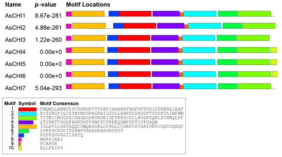 Distribution of conserved motifs in AsCHI proteins of A. sativum cv. Ershuizao. Analysis was performed using Multiple Em for Motif Elicitation (MEME) 5.3.0. The length of each box corresponds to that of the motif.