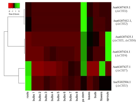 Heatmap of AsCHI1–7 mRNA expression in Allium sativum cv. Ershuizao tissues. Gene transcription was analyzed in roots, bulbs (1, 2, 3, 4, 5, 6, and 7 correspond to 192-, 197-, 202-, 207-, 212-, 217-, 222-, and 227-day-old bulbs), pseudo (ps) stems, leaves, buds, flowers, and sprouts. Colors red to green indicate a gene expression gradient from low to high.