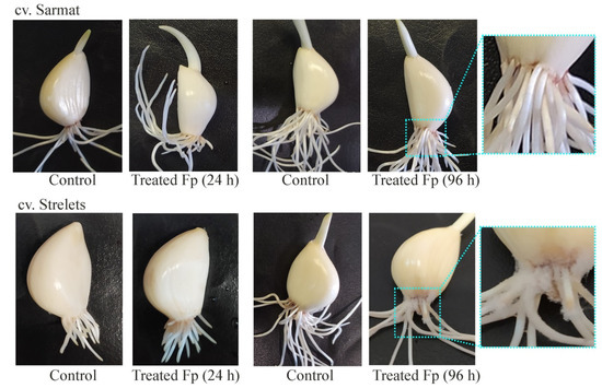 Garlic cv. Sarmat and Strelets resistant and susceptible to Fusarium rot, respectively, were infected with F. proliferatum, and analyzed for disease symptoms after 24 and 96 h. In cv. Sarmat, there were no symptoms of infection, whereas in cv. Strelets, the roots showed white fungal mycelium cover after 96 h (Figure 4). White mycelium is the reported symptom of Fusarium rot. Consequently, the external growth of the pathogen is observed only in the case of root colonization and indicates the sensitivity of the cultivar to this infection, while the tissues of the resistant cultivar are able to suppress the growth of fungi.
