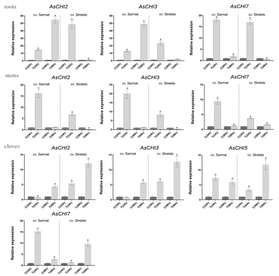 Analysis of AsCHI1-7 expression in roots, stems, and cloves of infected and control plants revealed that AsCHI1/AsCHI7, AsCHI2, and AsCHI3 were transcribed in all analyzed organs, whereas AsCHI4–6—only in cloves (Figure 5 and Figure 6). In Sarmat roots, the chitinase genes were significantly upregulated at 24 and 96 h after infection and in Strelets roots, the upregulation was observed only at 24 h, whereas at 96 h the expression of some genes was decreased (AsCHI1/AsCHI7), slightly increased (AsCHI2), or was the same (AsCHI3) compared to the control (Figure 5). In the stems, the activation of class I chitinase genes was observed in both cultivars at 24 h, but in cv. Sarmat it almost doubled that in cv. Strelets; however, at 96 h the expression of all AsCHI genes was significantly downregulated. In the cloves, the transcription of the analyzed genes was overall higher in all infected samples compared to the control. The mRNA expression of AsCHI2 and AsCHI3 increased with time; in cv. Strelets, it markedly exceeded that in cv. Sarmat where the expression level at 24 h was almost the same as in the control. However, the transcription of AsCHI1/AsCHI7 and AsCHI4–6 had different dynamics in the two cultivars, increasing with time in cv. Strelets and decreasing in cv. Sarmat (Figure 5).
