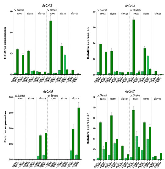 In control plants, the expression of the AsCHI genes was also time-dependent (Figure 6). In both analyzed cultivars, AsCHI1/AsCHI7 transcription increased from 24 to 96 h, except for cv. Strelets cloves, where it decreased. Compared to 24 h, at 96 h AsCHI2 and AsCHI3 were upregulated in the stems but downregulated in the roots and cloves, whereas AsCHI4–6 was slightly upregulated in the cloves of cv. Sarmat but significantly downregulated in those of cv. Strelets. In the stems of uninfected cv. Strelets, the levels of AsCHI2, AsCHI3, and AsCHI1/AsCHI7 expression were higher than in those of cv. Sarmat (Figure 6).