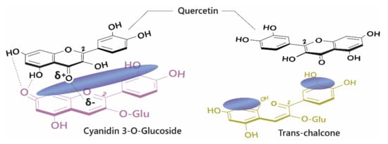 π–π interactions are not limited to arene moieties; cyclical aliphatic molecules have also been demonstrated to take part in these interactions, suggesting that the requirement for electron delocalisation (as seen in aromatics) is not strict [54]. This is particularly noteworthy within non-aromatic heterocycles, such as glucose, where the presence of an oxygen atom introduces asymmetry within the heterocycle, resulting in polarisation. Within any anthocyanin or co-pigment, there will be regions of high- and low-electron density. Therefore, the overall strength of intra- and intermolecular co-pigmentation interactions will depend on the alignment of these regions [53].